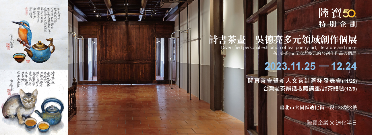 特邀兩岸知名茶文化大師吳德亮舉辦多元領域創作個展,將其詩、書、茶、畫,加上手拉題詩的新文人壺,以及木刻彩繪與陶燒彩繪、漆器茶盤等豐富多元的創作,推薦給愛茶與愛藝術的朋友。11月25日至12月24日將於台北市迪化街一段巴洛克歷史建築正式發表,在這以茶聞名的大稻埕百年老屋裡,更別具劃時代的意義。