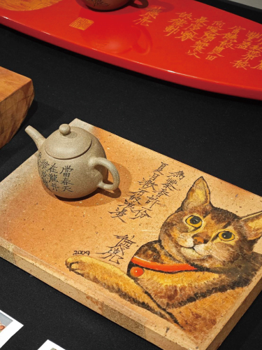 #茶票畫:以雲南鶴慶山區千里迢迢攜回或中後期紅印、大益等茶票紙做為媒材,以水彩在多纖維棕黃的暈染,厚實的層層紙本瞬間包容大量渲染的水分,畫面更顯飽滿豐盈;原本鋒芒銳利的色彩也如茶品陳化般,逐漸回穩收斂, 搭配「德亮體」手寫詩文,詩即是畫、畫也是詩,巧妙融合一體,絕無僅有。