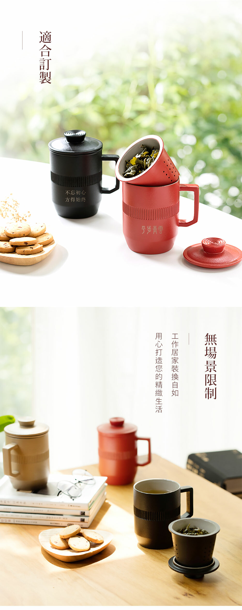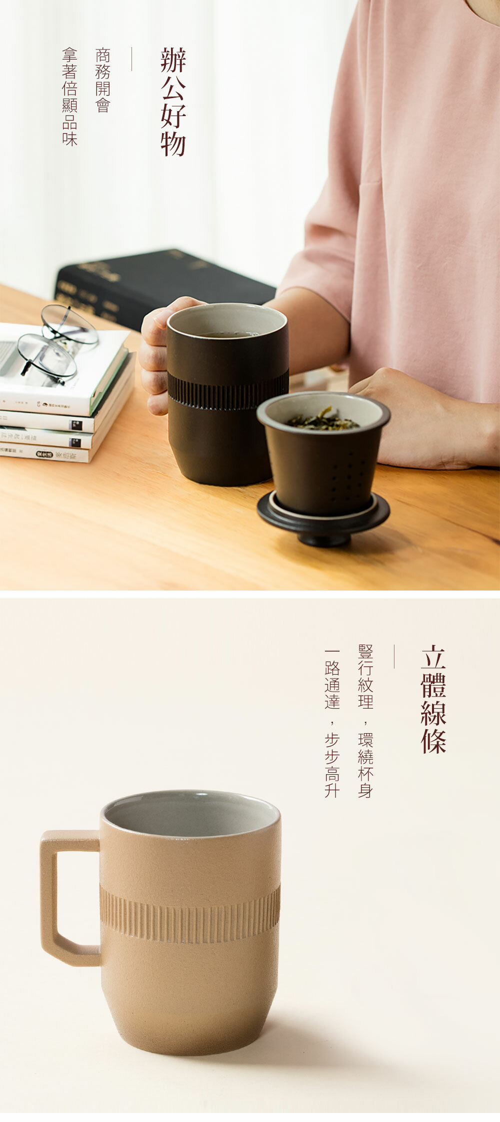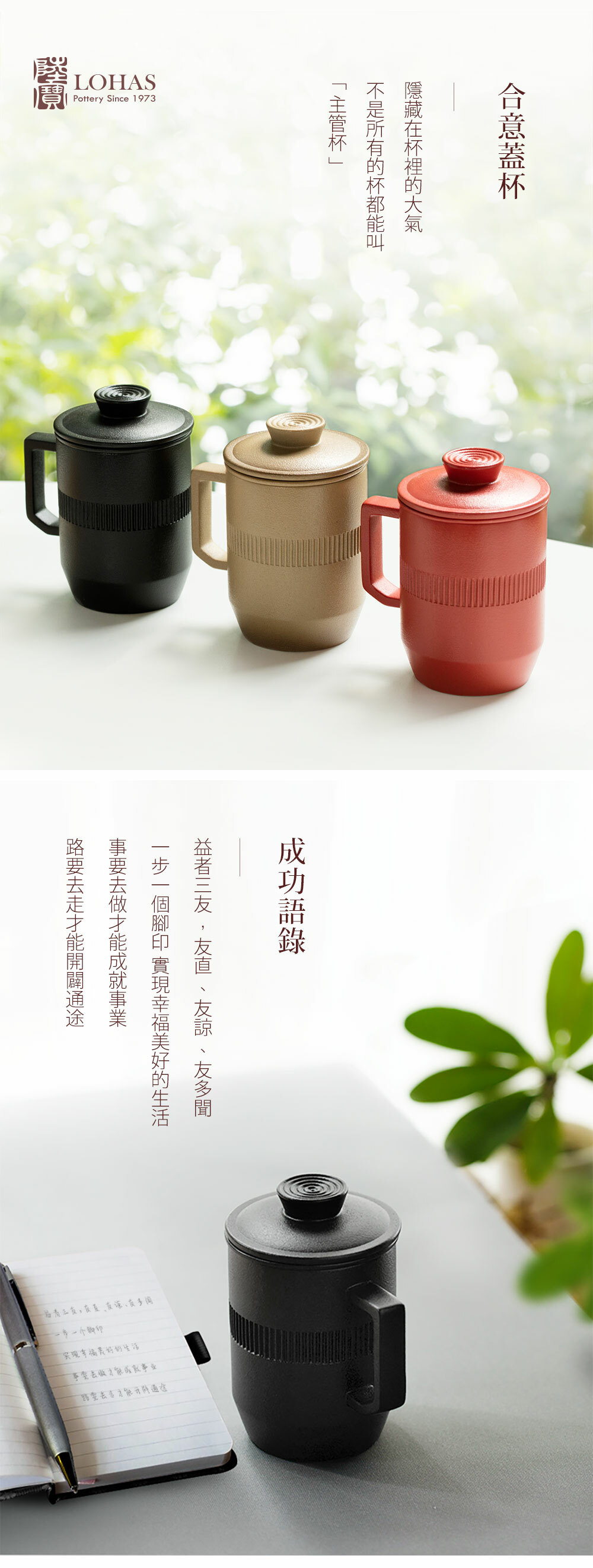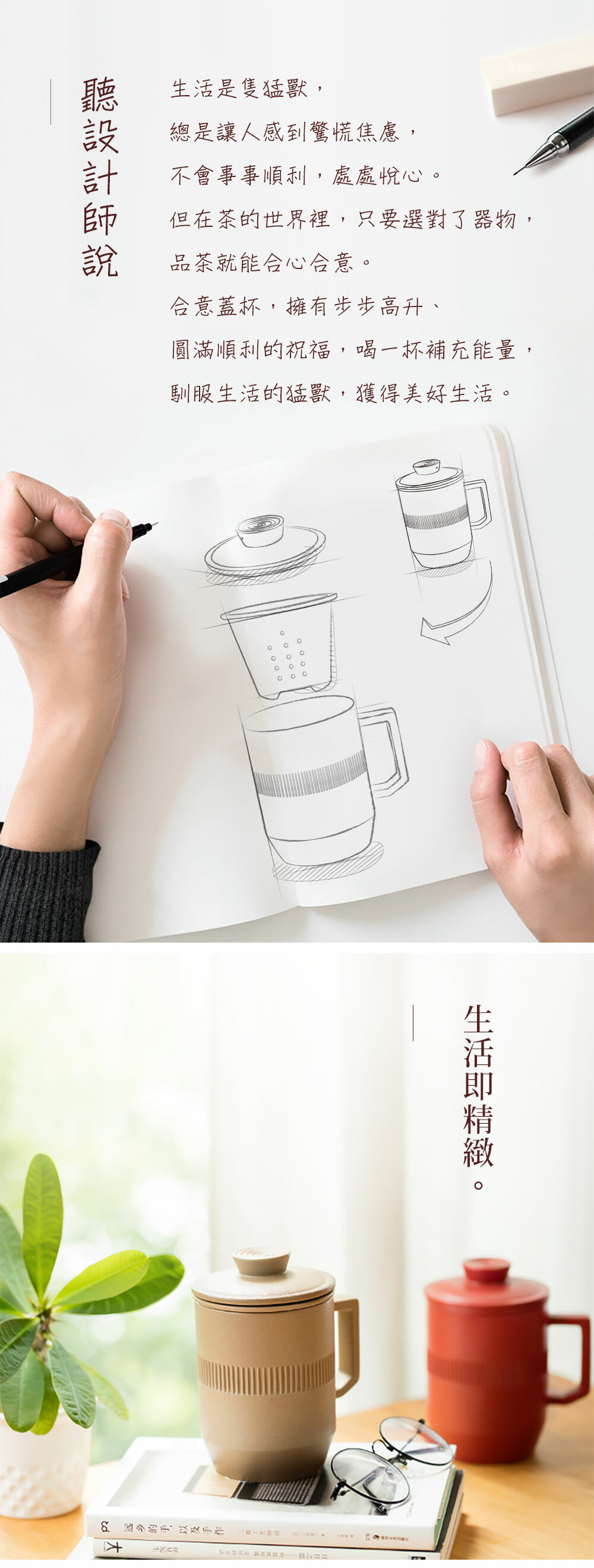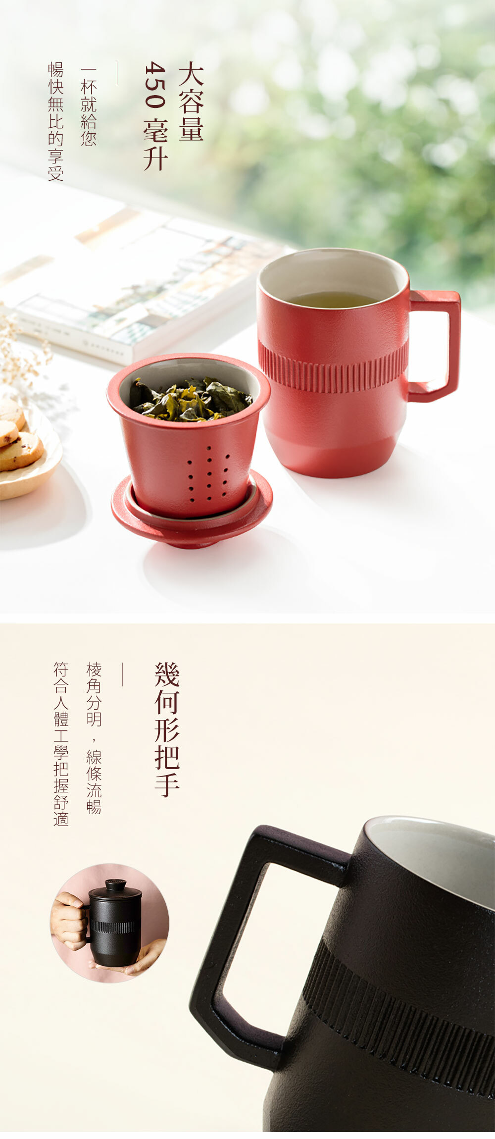 杯身與蓋環繞簡約線條,展現圓滿順利的美好寓意。幾何棱角把手,符合人體工學,把握舒適。