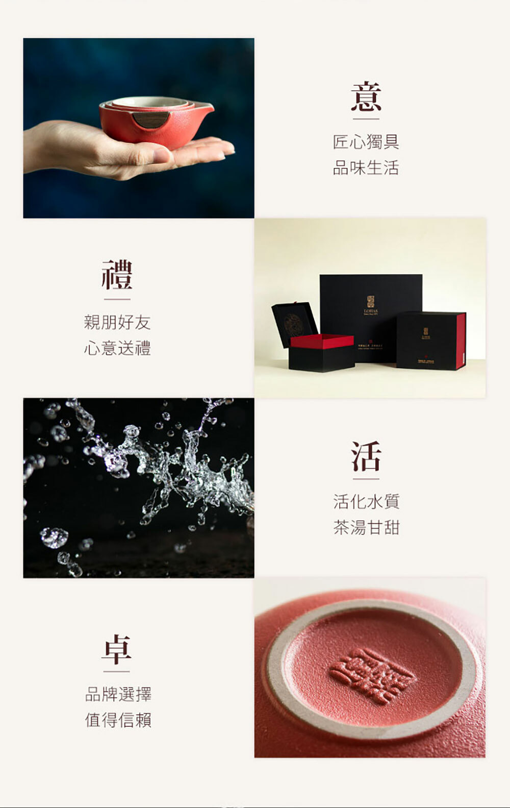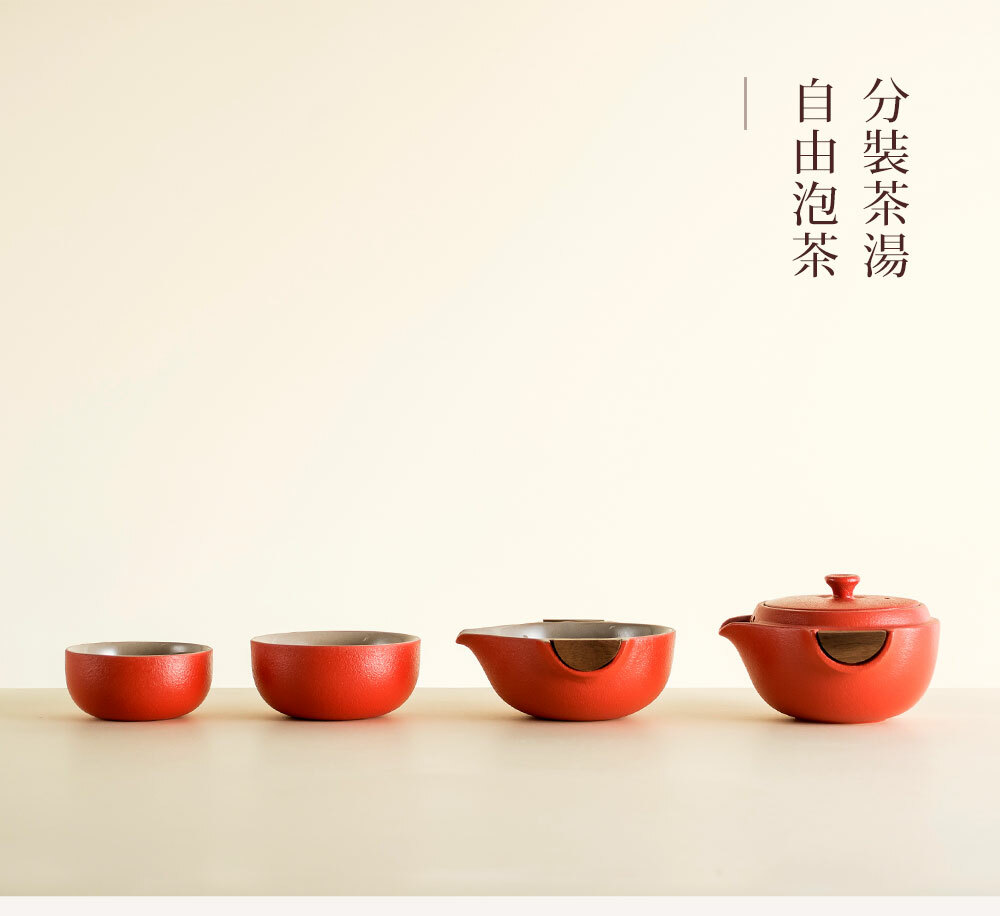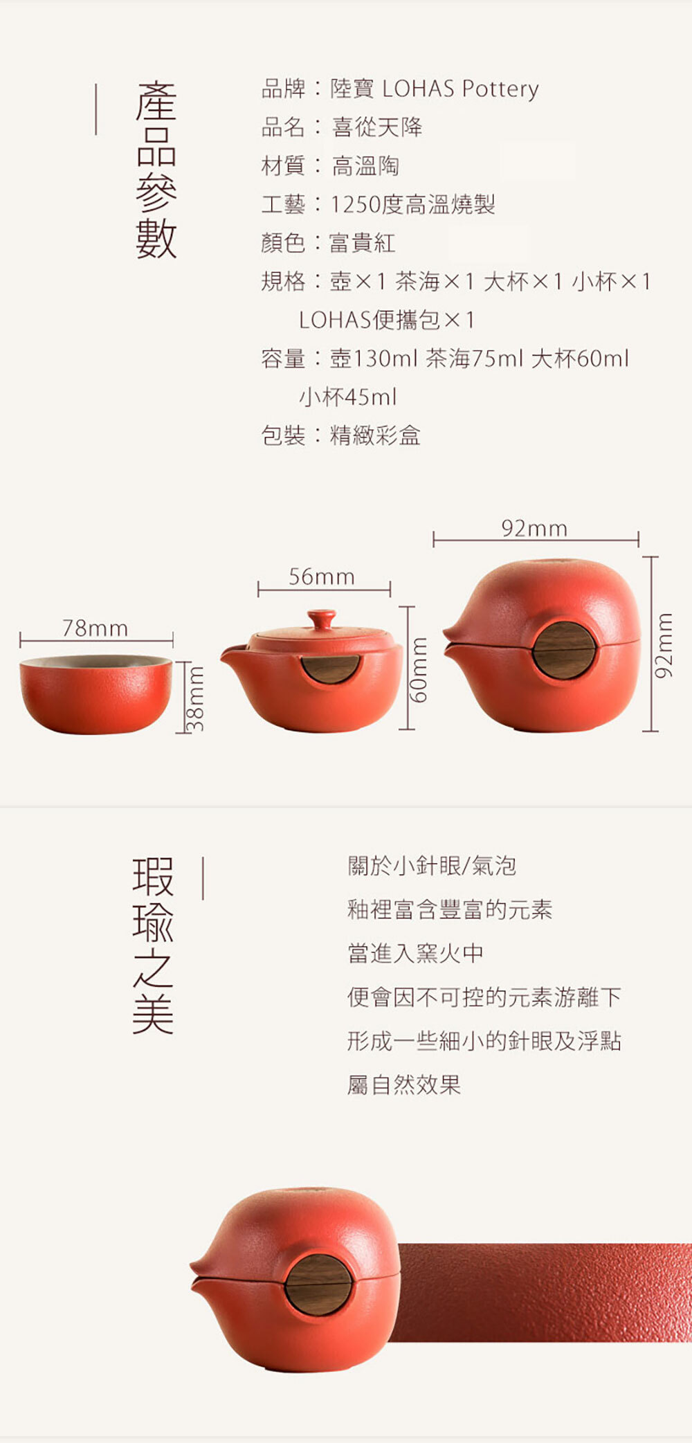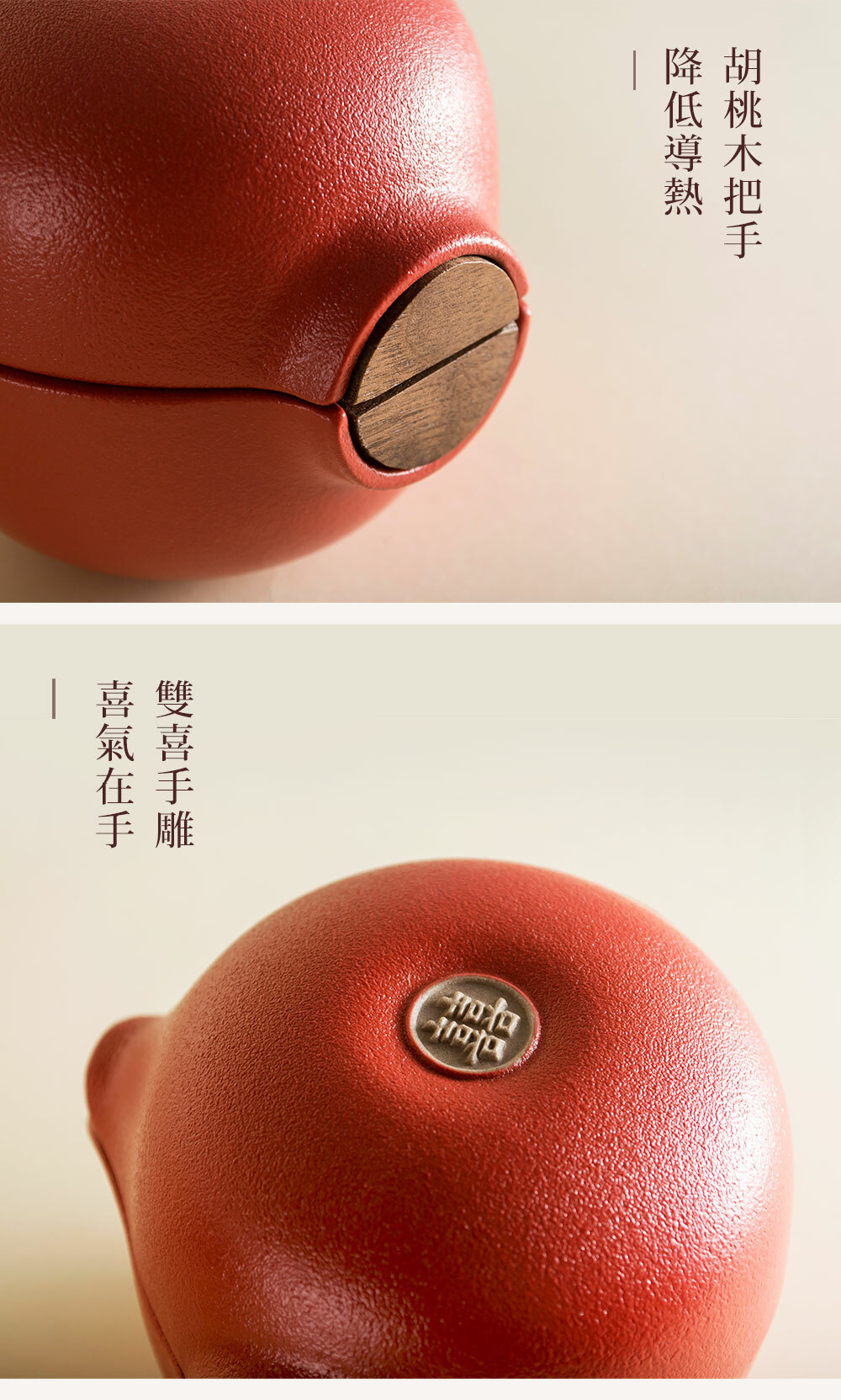 選用傳統象徵富貴的宮牆紅釉色,茶海及杯底浮雕「囍」字,寓意吉祥,喜氣在手。能量釉層,不挑茶種,釋放茶的完整色香味,胡桃木半月型把手,隔熱防燙,質感特別,專用硬殼便攜包,收納方便攜帶輕鬆。