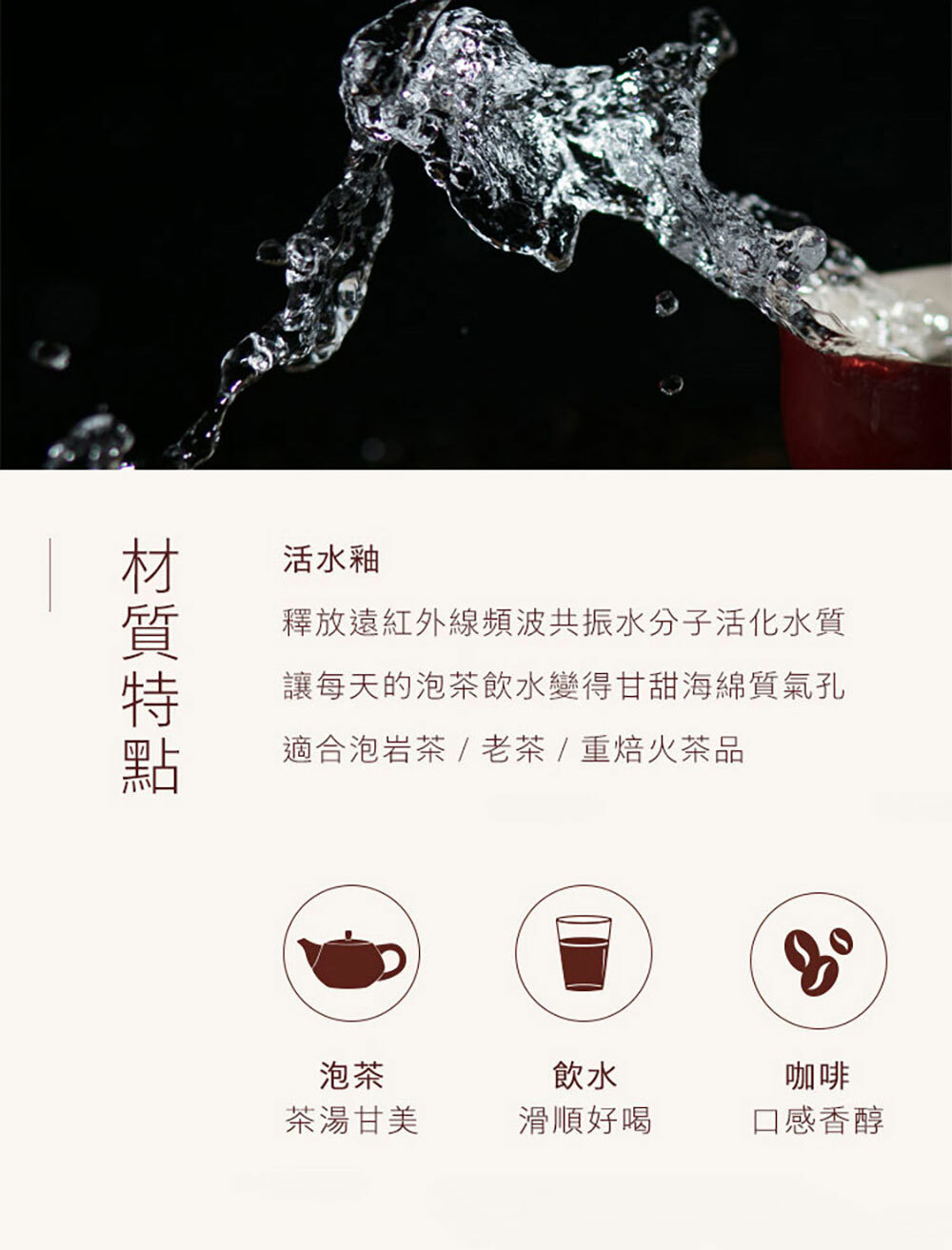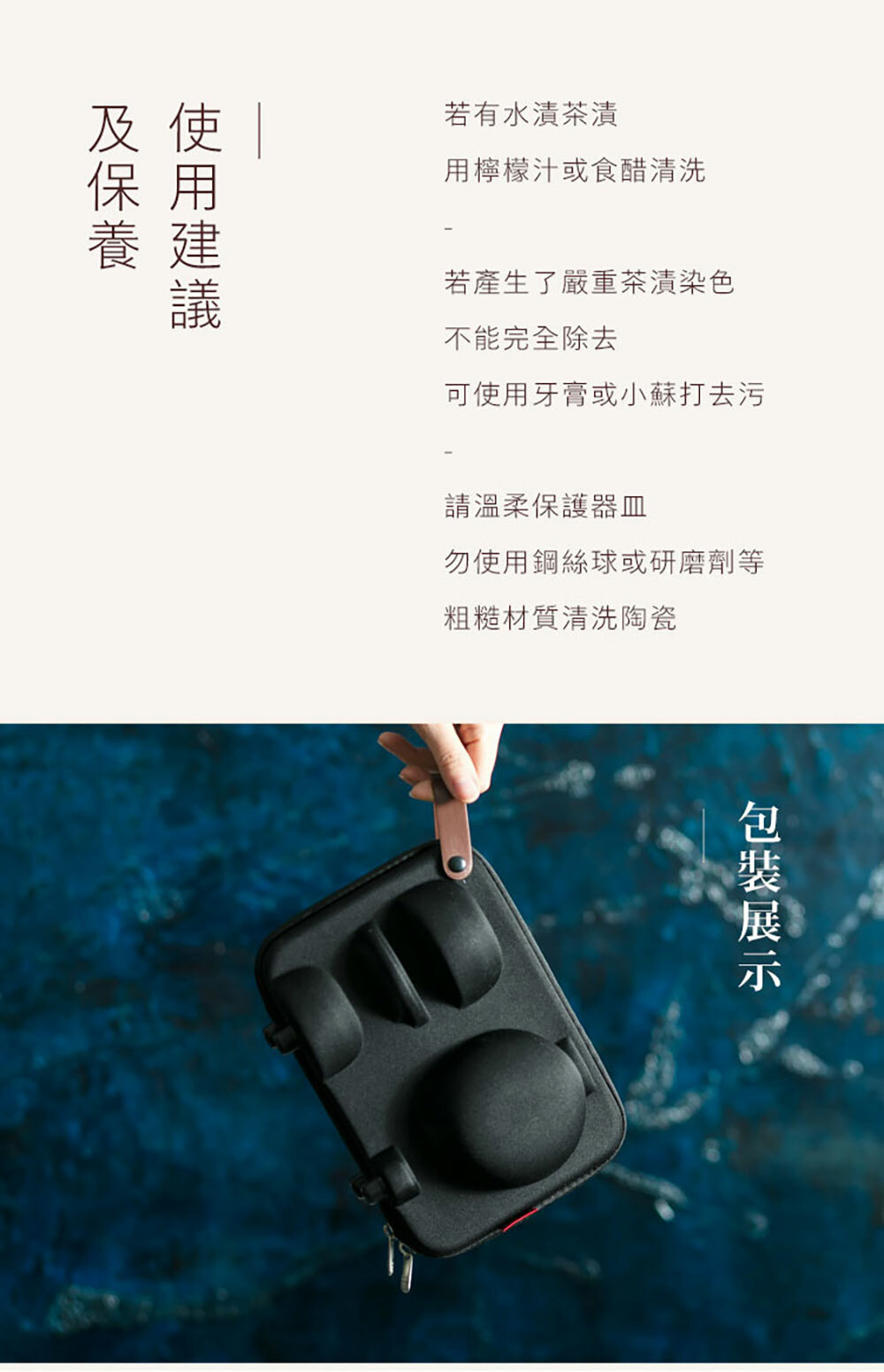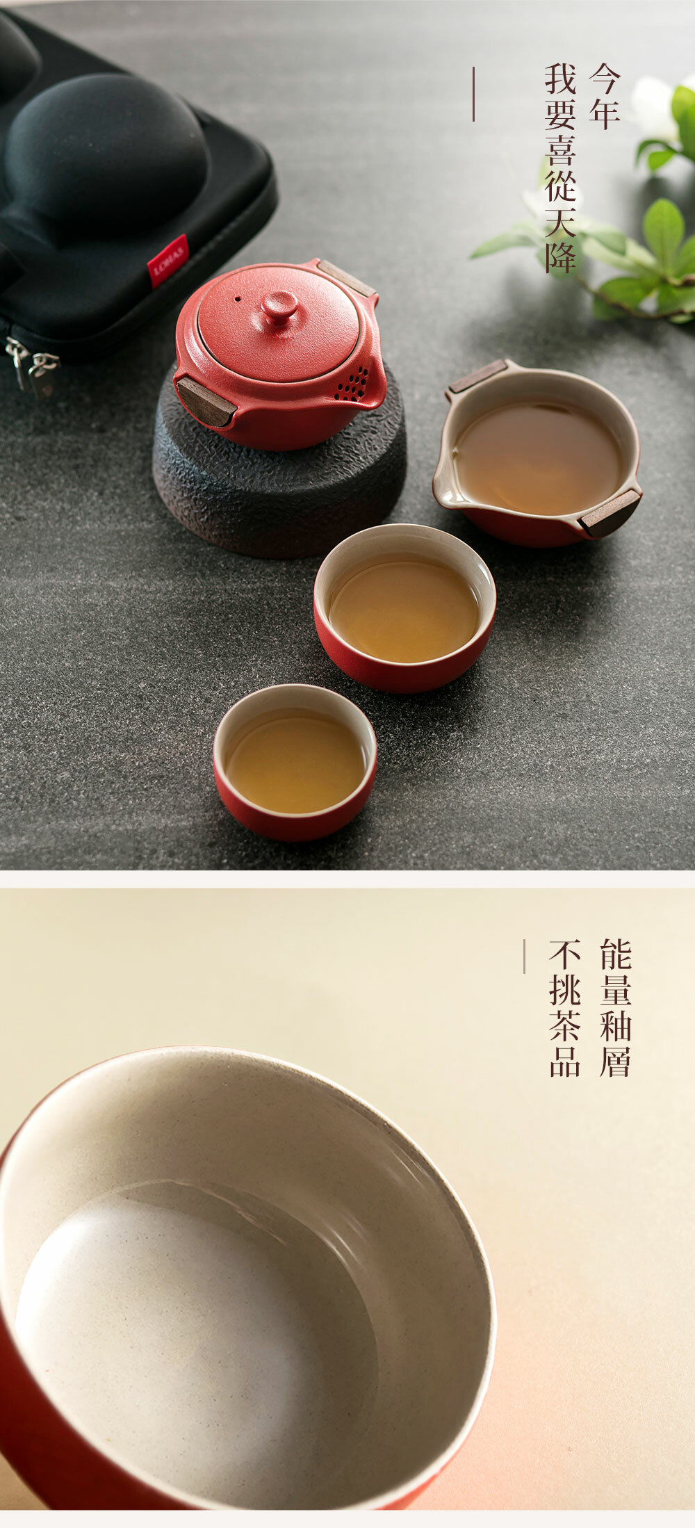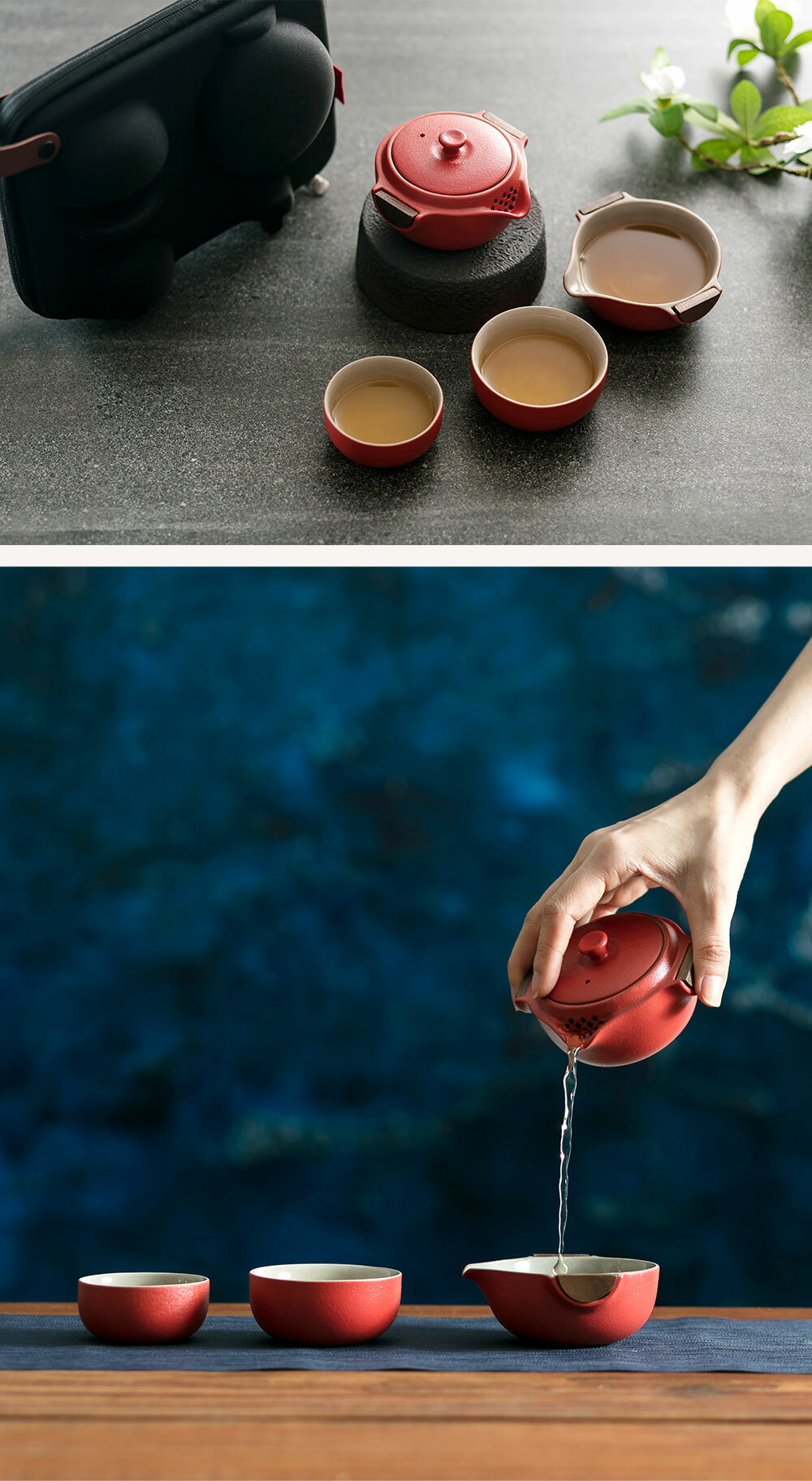 選用傳統象徵富貴的宮牆紅釉色,茶海及杯底浮雕「囍」字,寓意吉祥,喜氣在手。能量釉層,不挑茶種,釋放茶的完整色香味,胡桃木半月型把手,隔熱防燙,質感特別,專用硬殼便攜包,收納方便攜帶輕鬆。