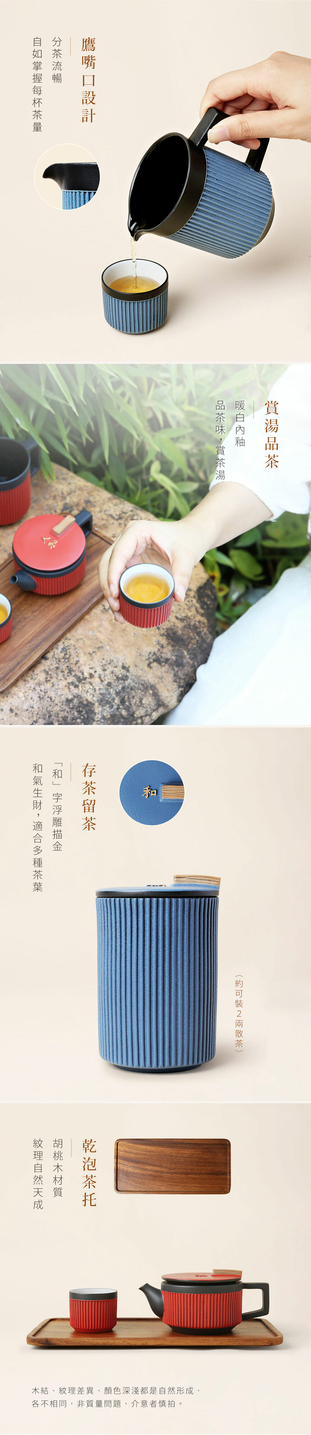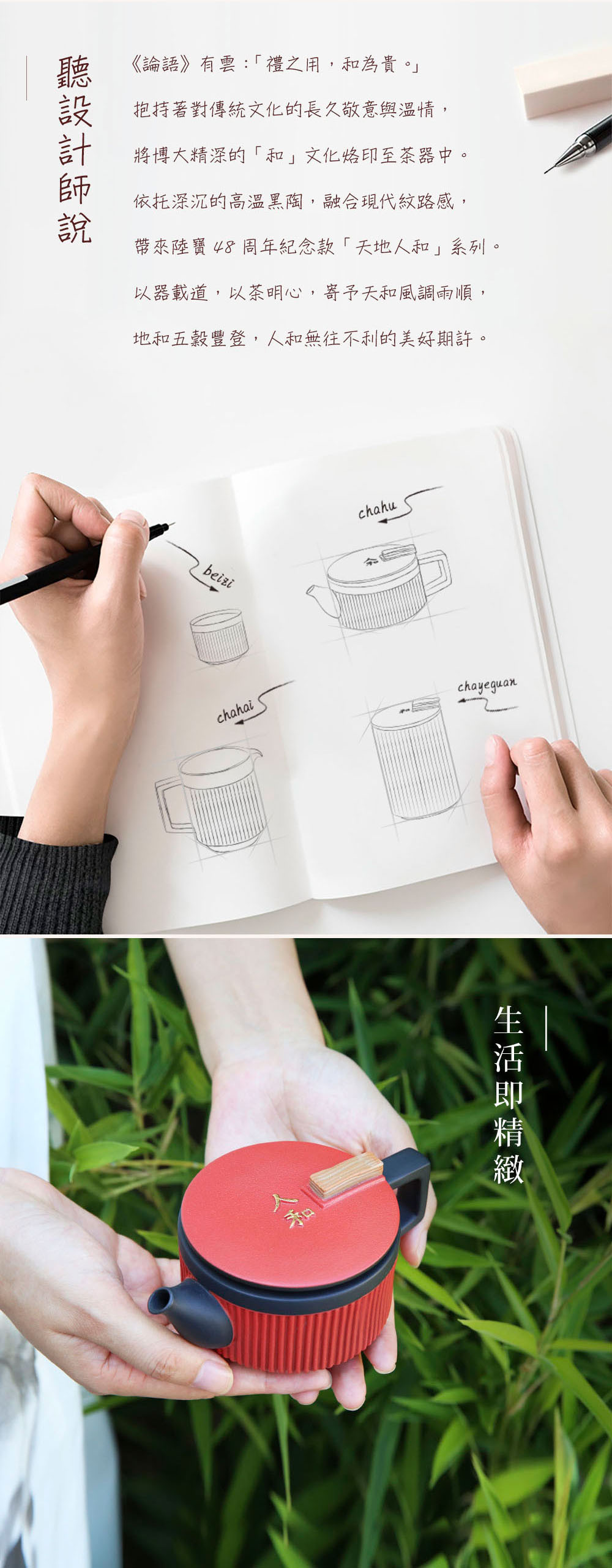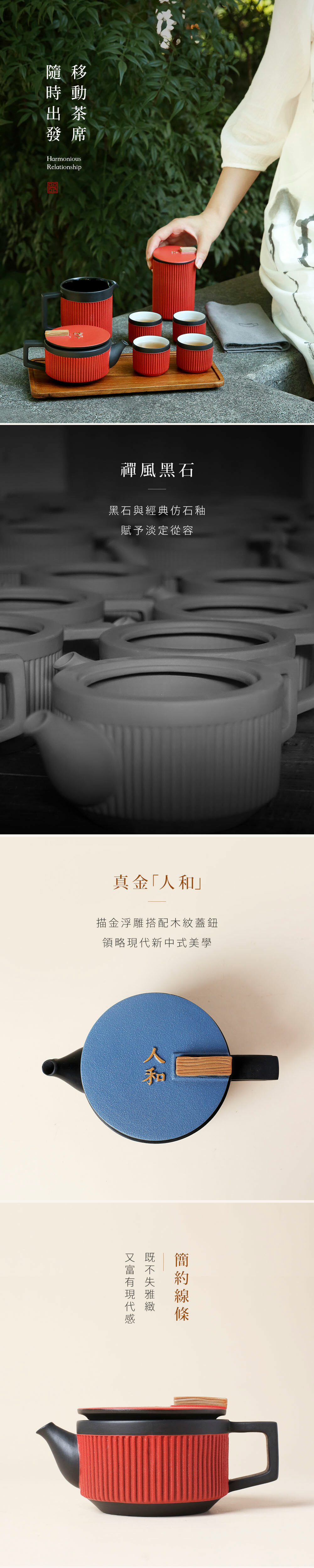 依託著穩重的高溫黑陶為骨,禪風仿石釉搭配上充滿現代感的豎紋,飾於蓋上的手工描金「人和」浮雕,展現出以當代美學重新詮釋的中式茶具新風貌。