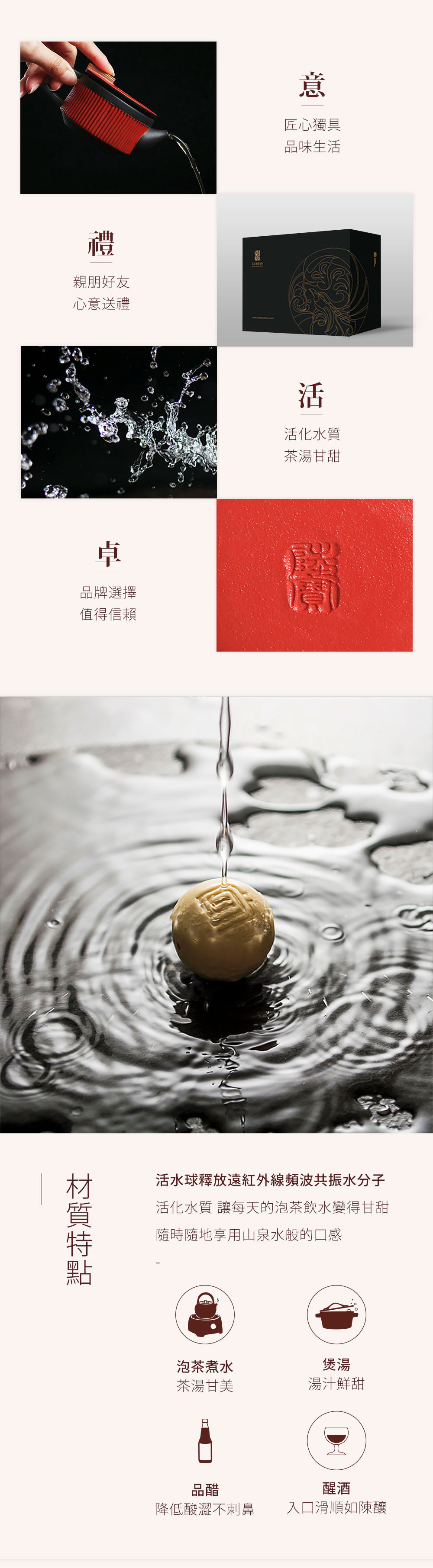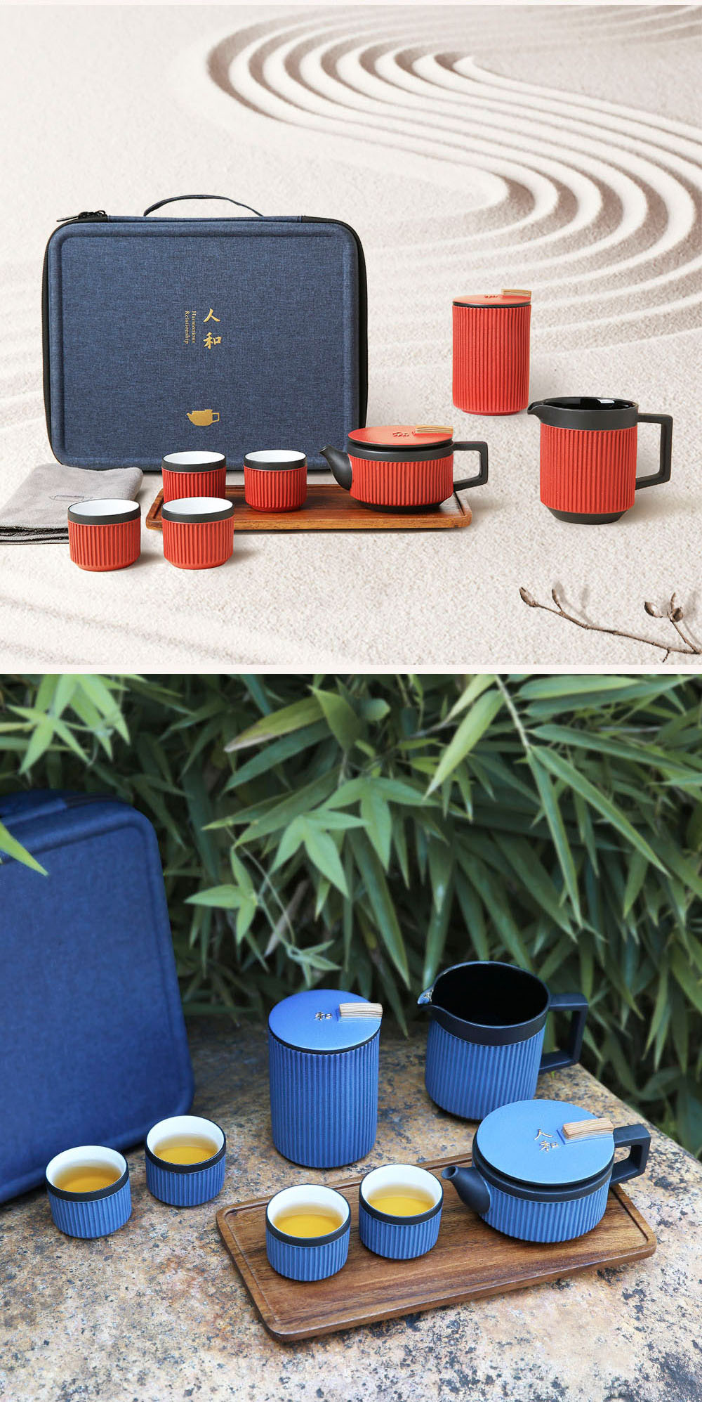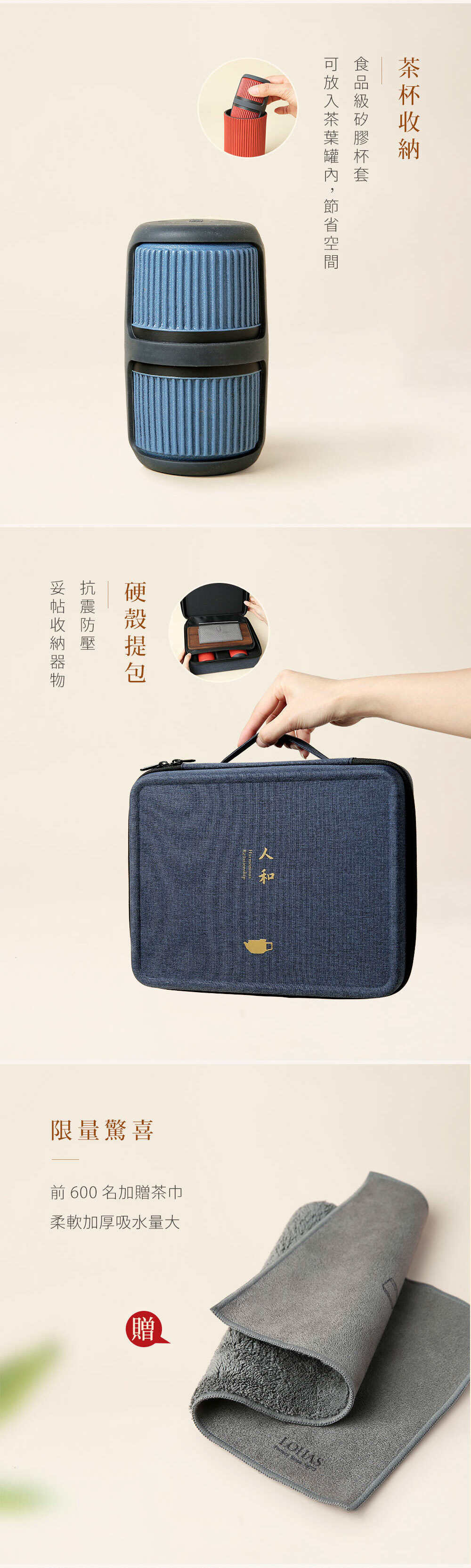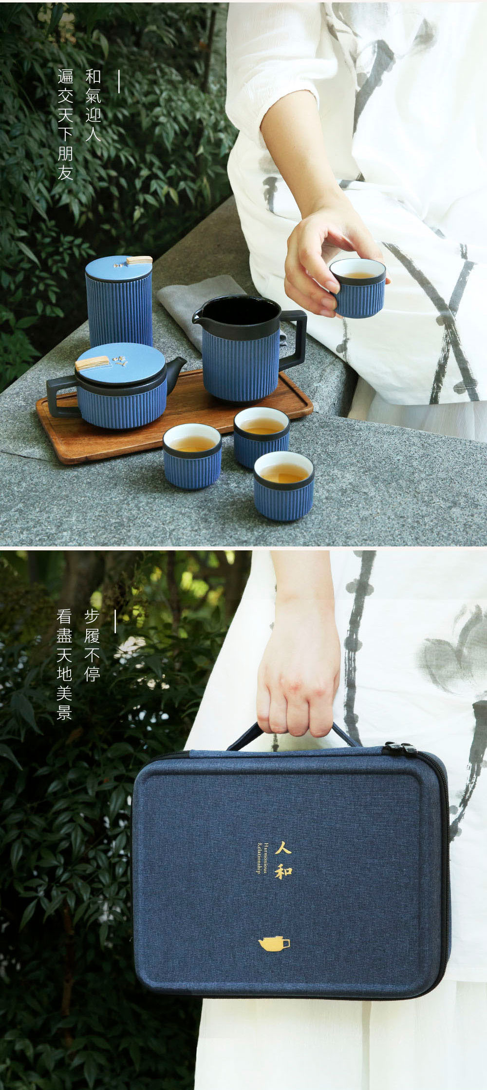 依託著穩重的高溫黑陶為骨,禪風仿石釉搭配上充滿現代感的豎紋,飾於蓋上的手工描金「人和」浮雕,展現出以當代美學重新詮釋的中式茶具新風貌。