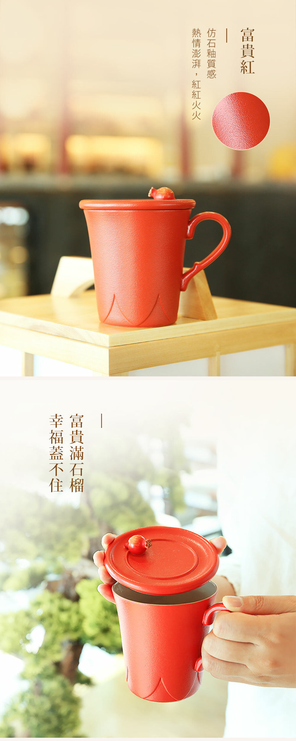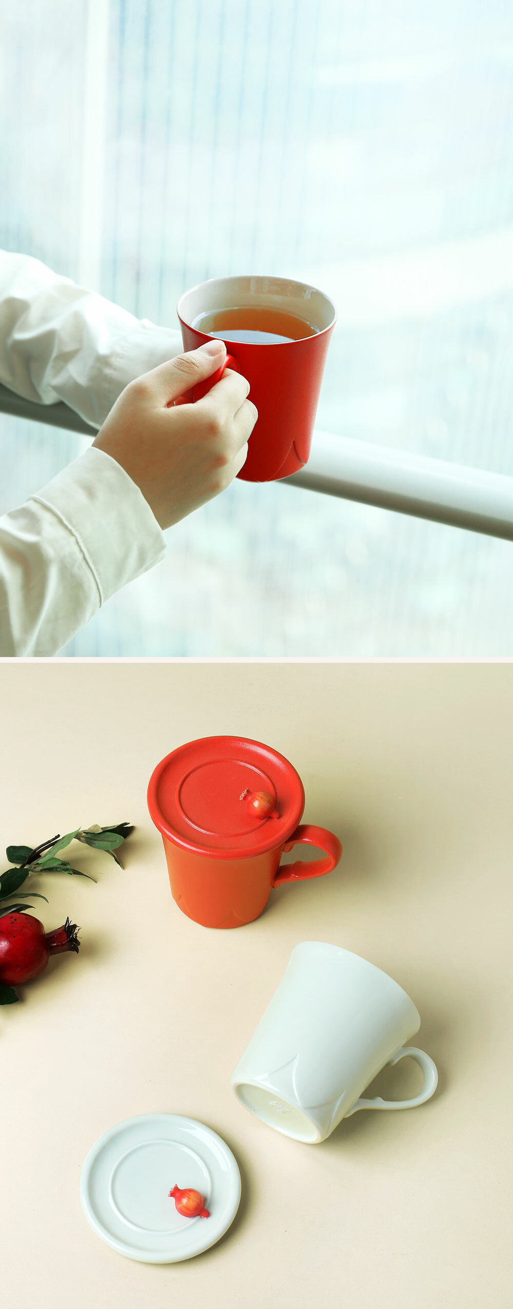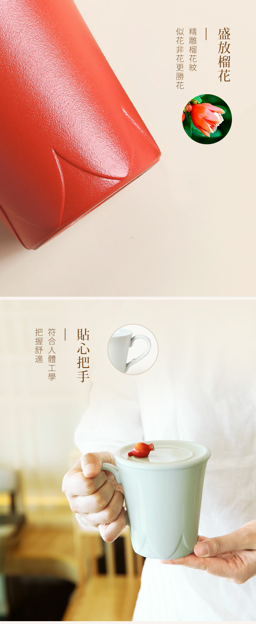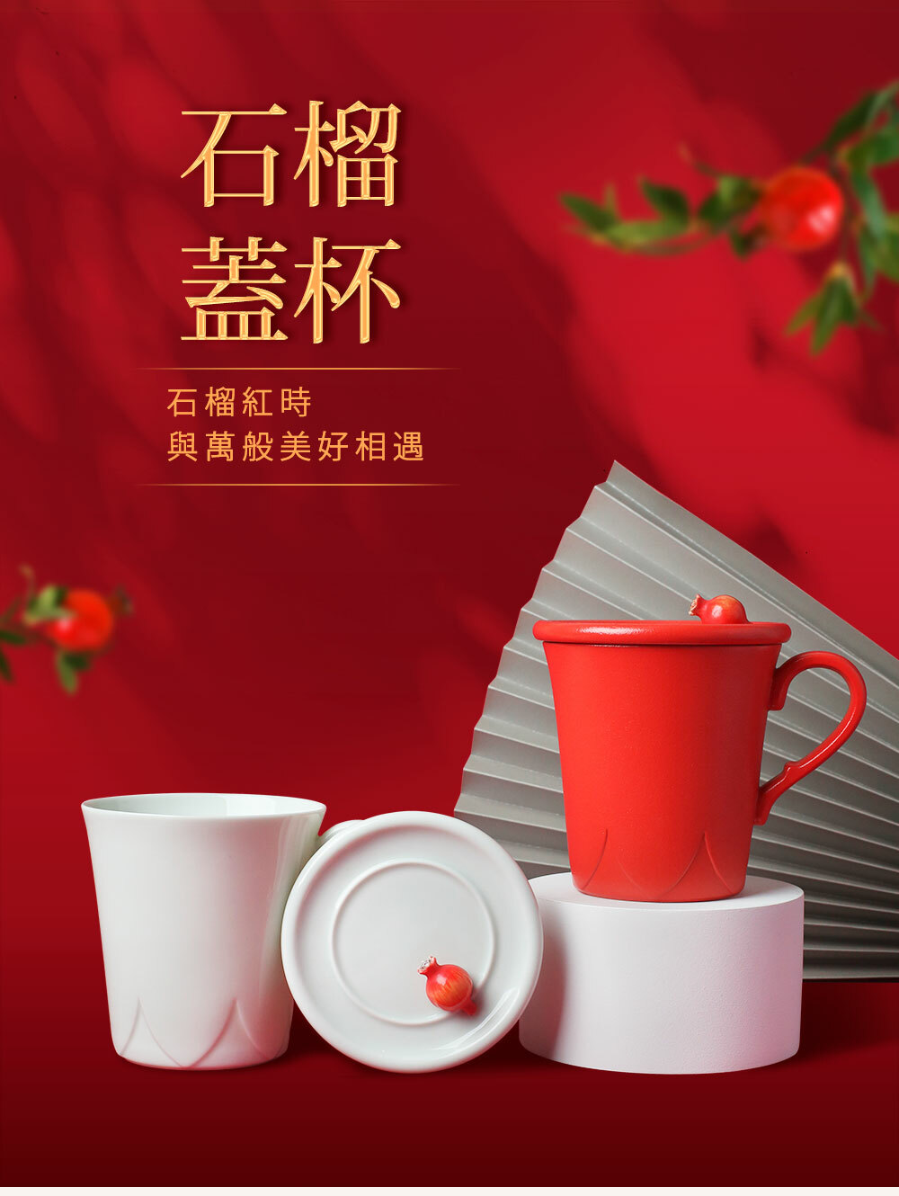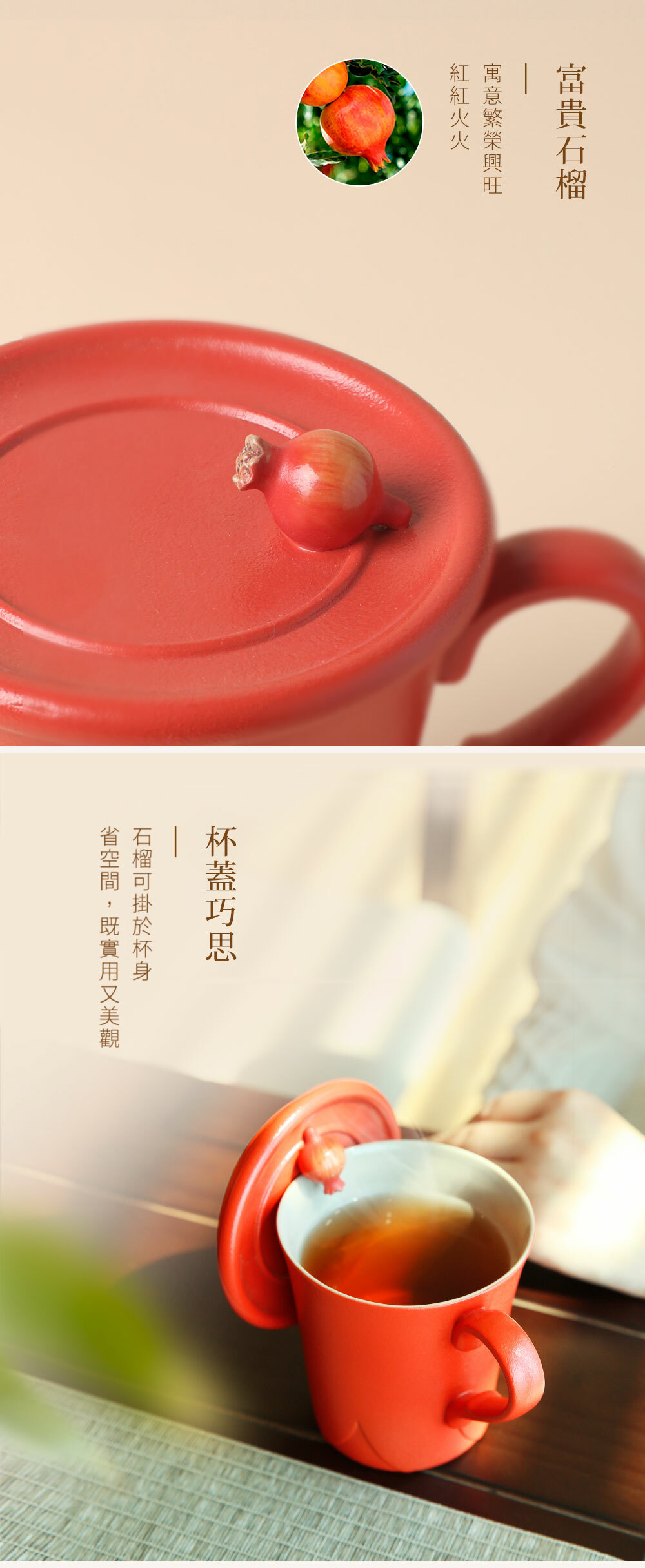 石榴為祥瑞之果,寓意興旺美好。飽滿豐潤的石榴立於蓋上,象徵多子多福、繁榮興旺,掛於杯緣可將蓋子掛於杯身;明豔動人的榴花綻放於杯身,紅火景象映入眼簾,令人為之傾心。