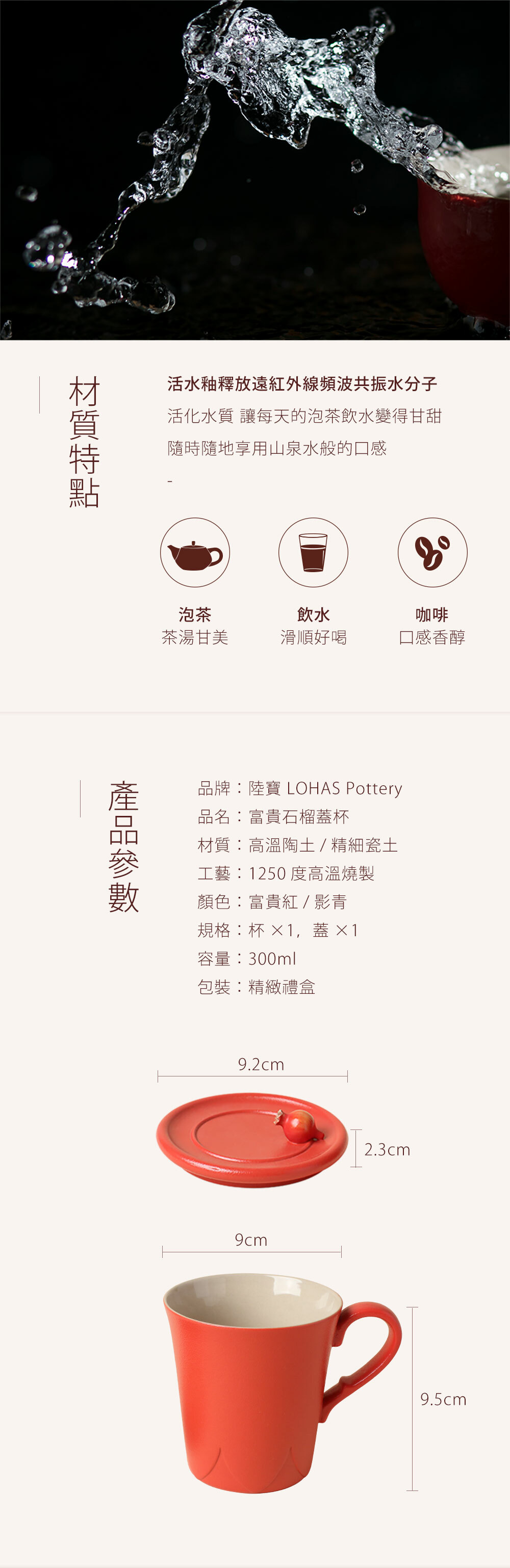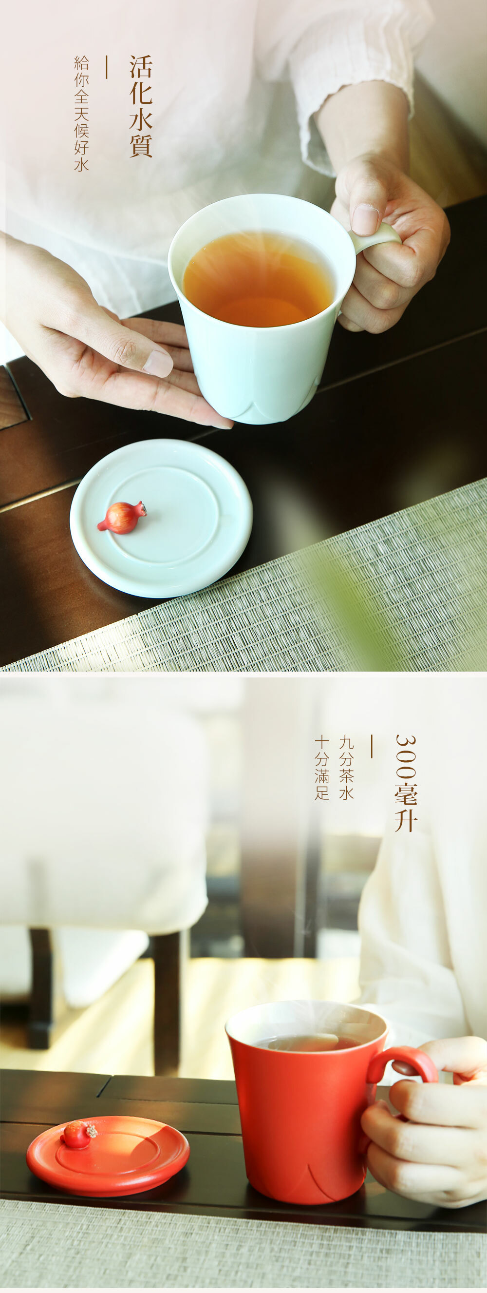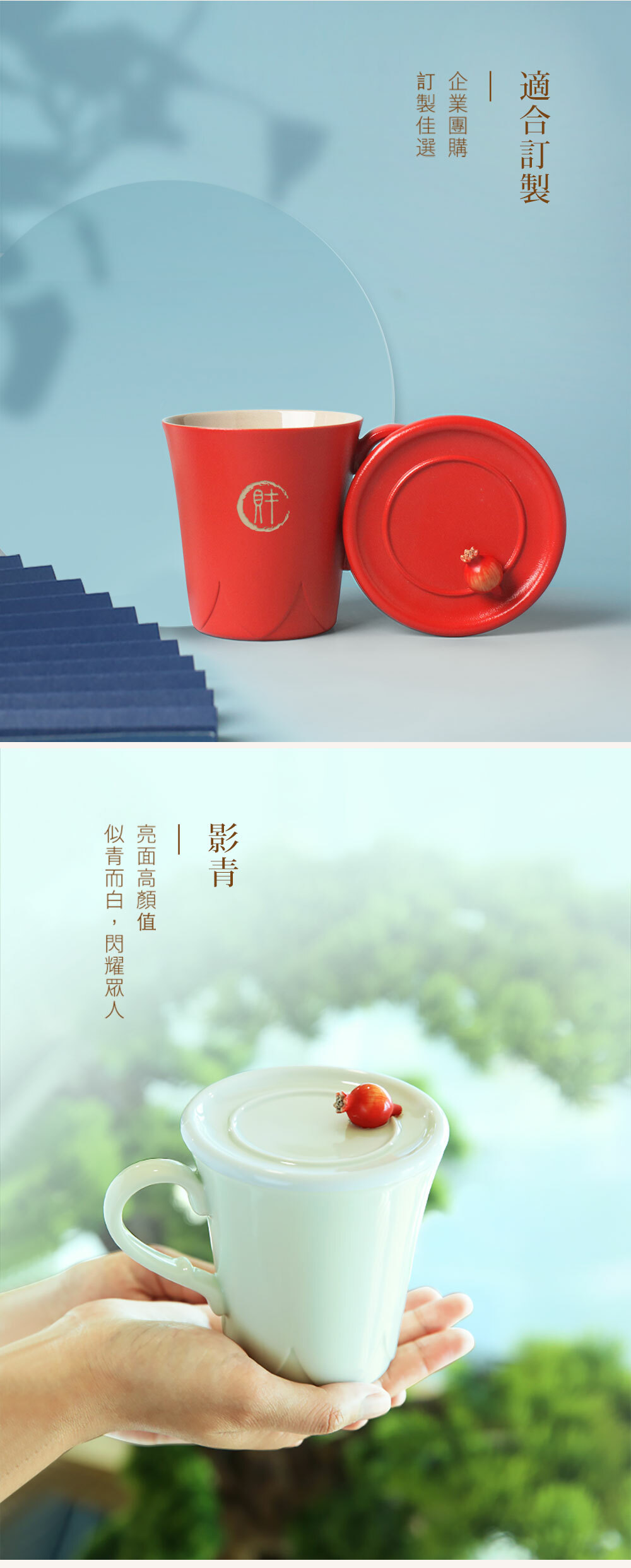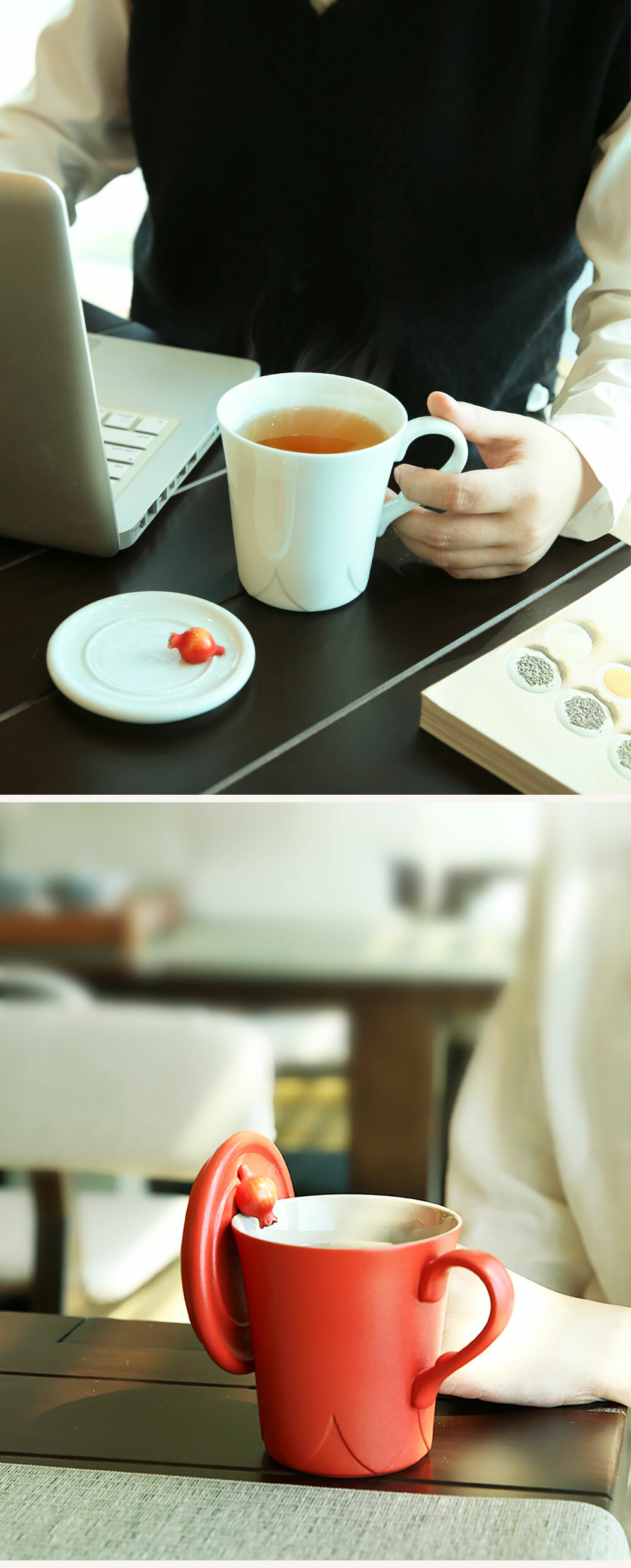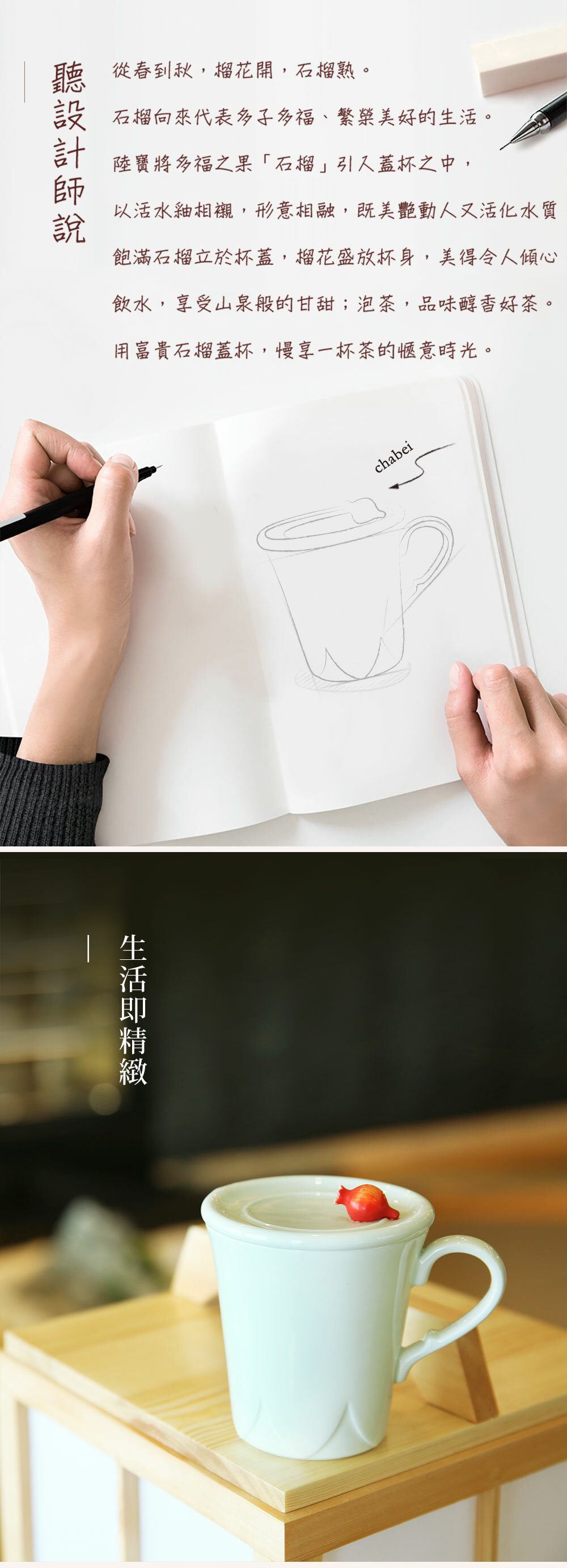 石榴為祥瑞之果,寓意興旺美好。飽滿豐潤的石榴立於蓋上,象徵多子多福、繁榮興旺,掛於杯緣可將蓋子掛於杯身;明豔動人的榴花綻放於杯身,紅火景象映入眼簾,令人為之傾心。