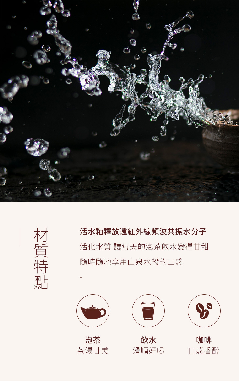 圓甕杯型設計,上小下闊,雍容穩重體態,造型討喜。杯身上呈現浮雕朵雲,以鉑金水手繪,如祥雲瑞氣,予以吉祥。